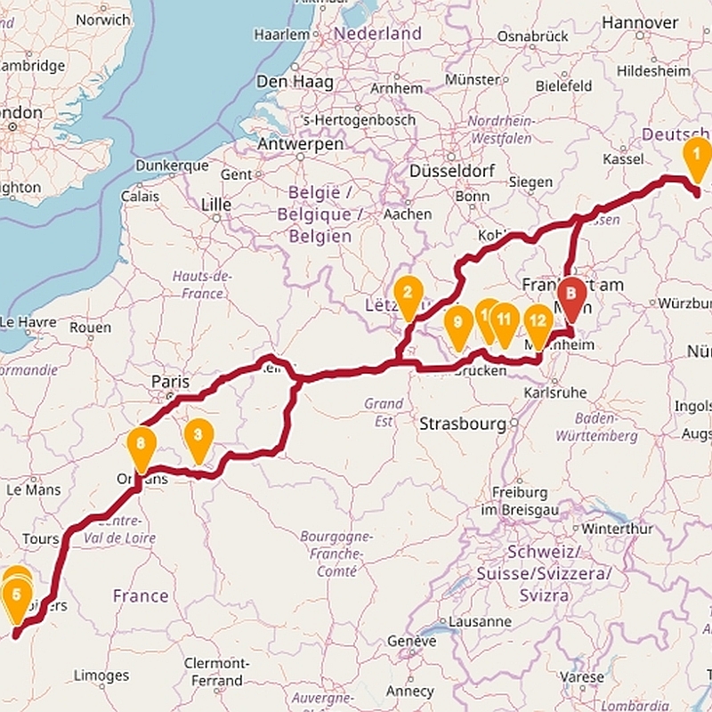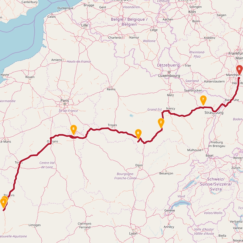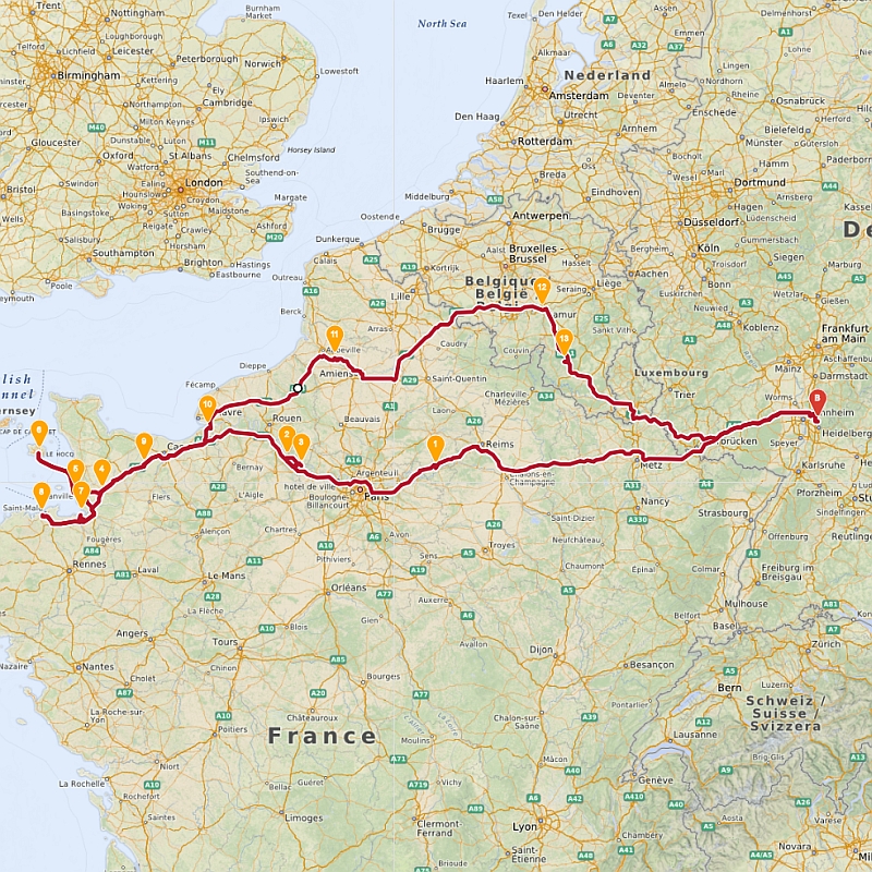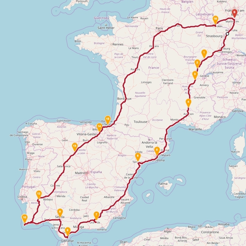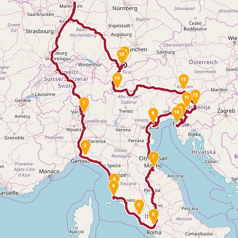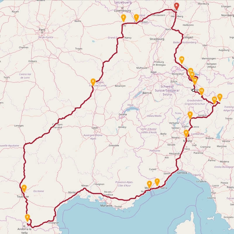 Hombourg-Haut ≫ Metz ≫ Beaune ≫ Toulouse ≫ Ransol ≫ Monaco ≫ San Remo ≫ Mailand ≫ Como ≫ Stilfser Joch ≫ Laas ≫ Davos ≫ Vaduz ≫ St.Gallen ≫ Appenzell