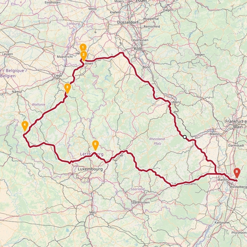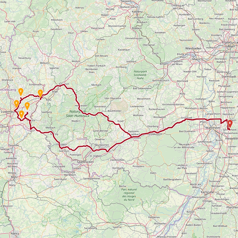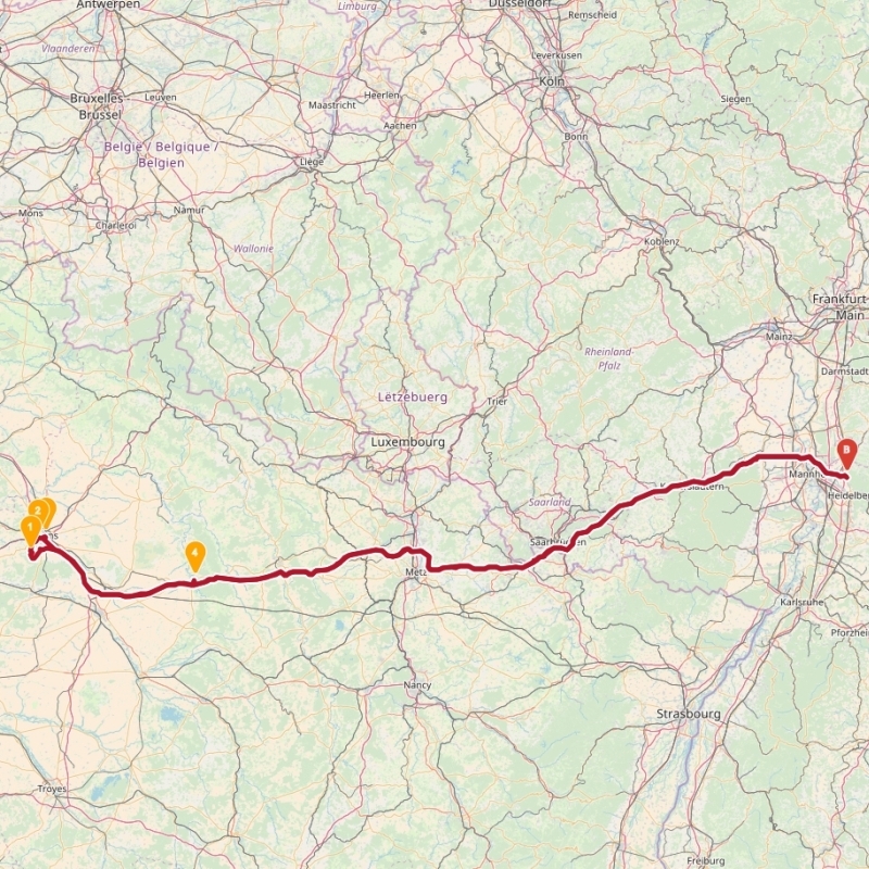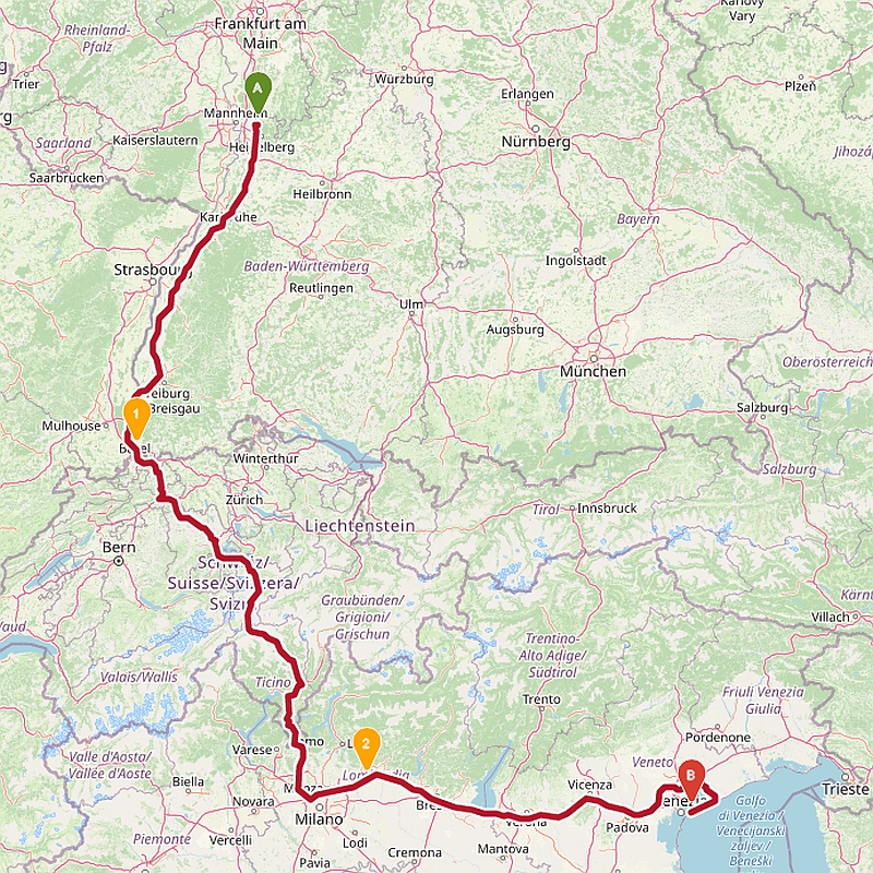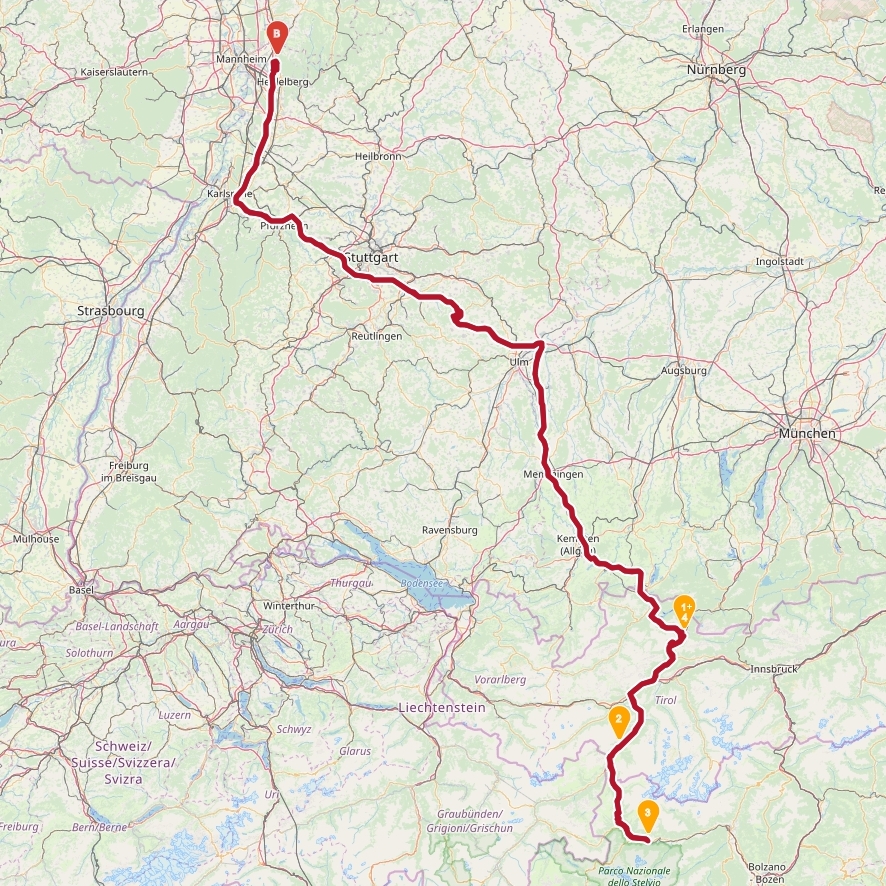 Hombourg-Haut ≫ Metz ≫ Beaune ≫ Toulouse ≫ Ransol ≫ Monaco ≫ San Remo ≫ Mailand ≫ Como ≫ Stilfser Joch ≫ Laas ≫ Davos ≫ Vaduz ≫ St.Gallen ≫ Appenzell